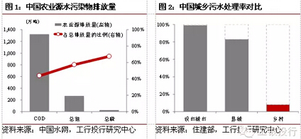 2. 上山下鄉(xiāng),到農(nóng)村去長期以來,在我國農(nóng)業(yè)領(lǐng)域的環(huán)保問題一直沒有得到充分的重視,但實際上這一領(lǐng)域的污染問題已經(jīng)相當突出。在水體污染方面,目前農(nóng)業(yè)源占我國COD排放量的比例_過40%,占總氮排放的比例在60%左右,占總磷排放的比例_是高達70%左右。目前我國農(nóng)業(yè)水污染治理程度嚴重偏低,還處于起步階段。據(jù)統(tǒng)計,我國僅北京、天津、上海、江蘇、浙江、廣東等少數(shù)發(fā)達省市的農(nóng)村生活污水處理率能夠_過10%,其他大部分省份還未全面鋪開。在我國環(huán)境承載能力日益逼近上限的現(xiàn)狀下,農(nóng)村環(huán)境治理問題開始受到高層重視,近年來,國務(wù)院、環(huán)保部、財政部、發(fā)改委在多個文件中均重點提及,而農(nóng)業(yè)部近日下發(fā)的《關(guān)于打好農(nóng)業(yè)面源污染防治攻堅戰(zhàn)的實施意見》_是給出了一個較為全面的實施路線圖。